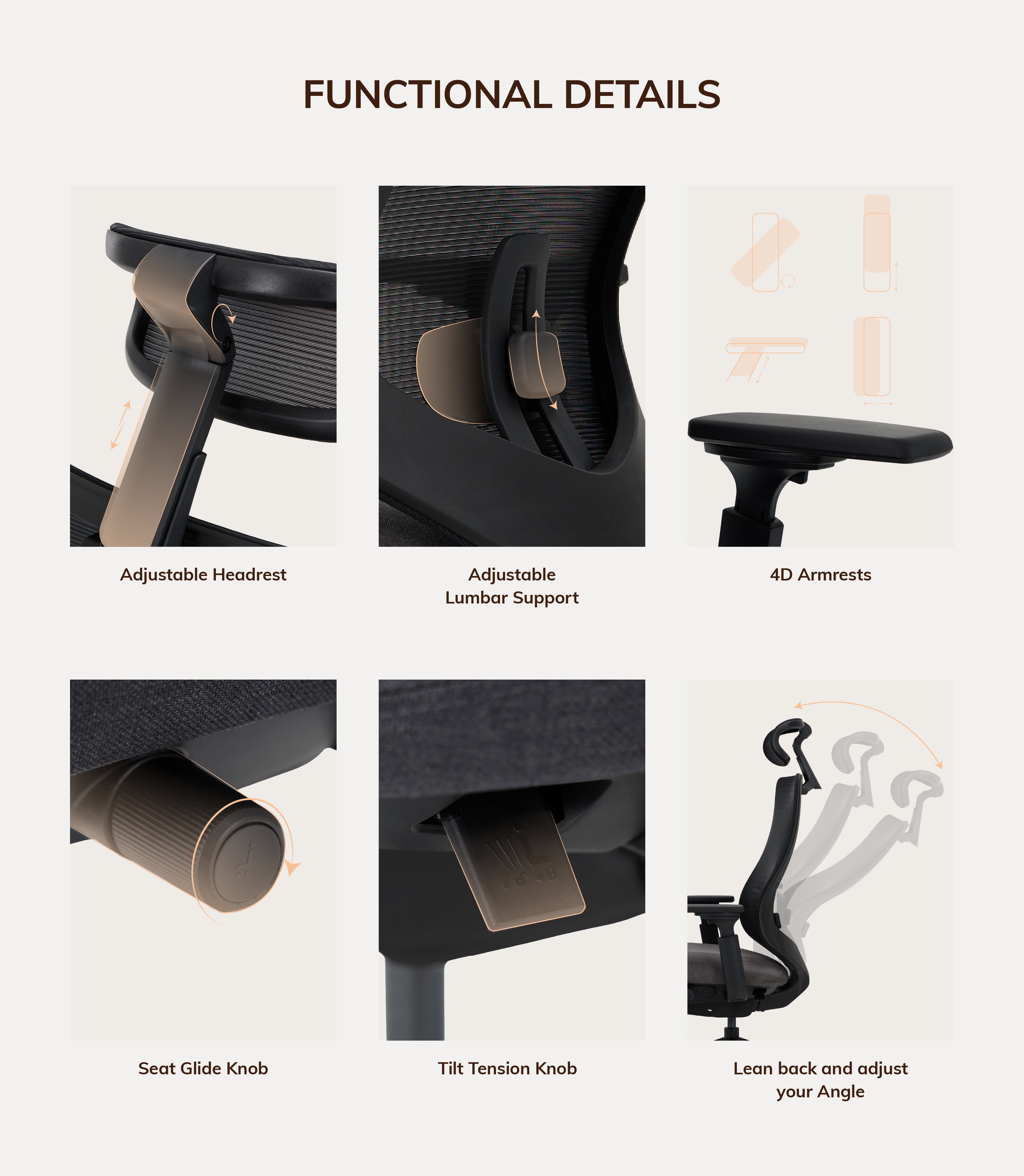 - Adjustable Headrest/ Adjustable 4D Armrest/ Adjustable Lumbar Support/ Adjustable Seat Depth/ AdjustableBackrest